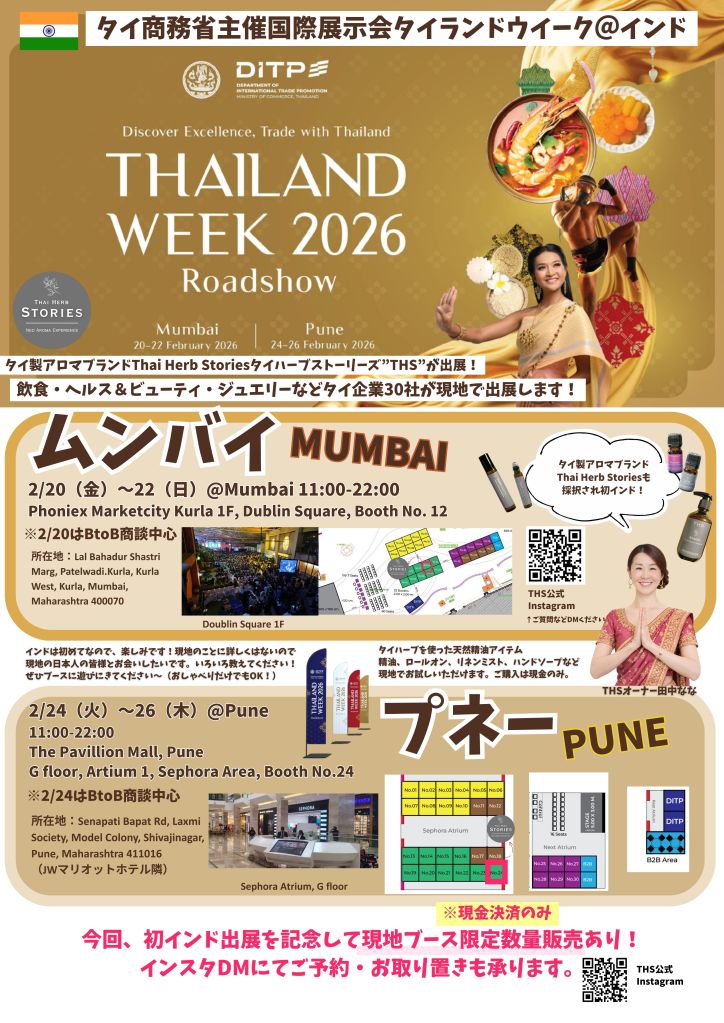 2026年2月、タイ商務省主催イベントThailand Week 2026に参加します。開催地はインド(2/20-22@ムンバイ、2/24-26@プネー)です。現地でお目にかかれますことを楽しみにしております。